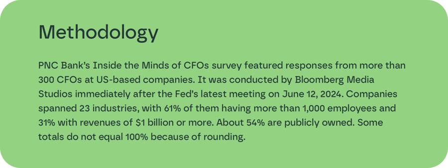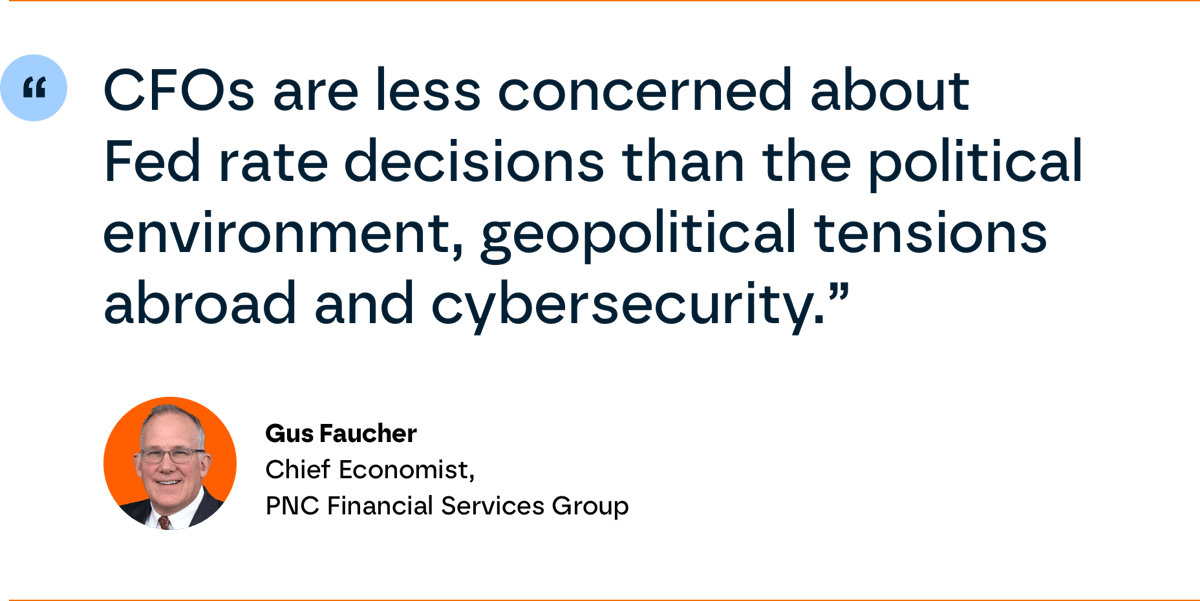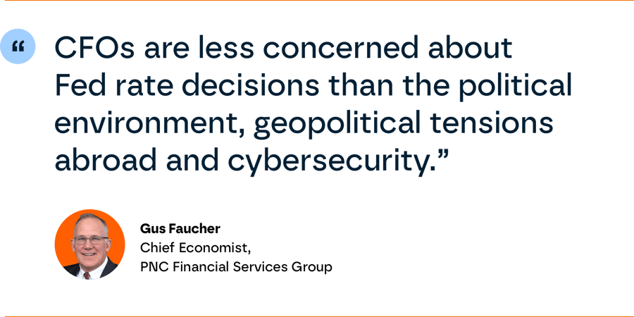 “CFOs know the Fed will eventually cut rates. This seems to be a given they can plan for, even as persisting uncertainty about the possibility of a recession may have influenced some of the survey results," says Faucher. "In the meantime, they’re more concerned about other big uncertainties, including the political environment and resulting regulatory impacts from the upcoming election, as well as geopolitical tensions abroad and concerns such as cybersecurity that are hitting them closer to home.”