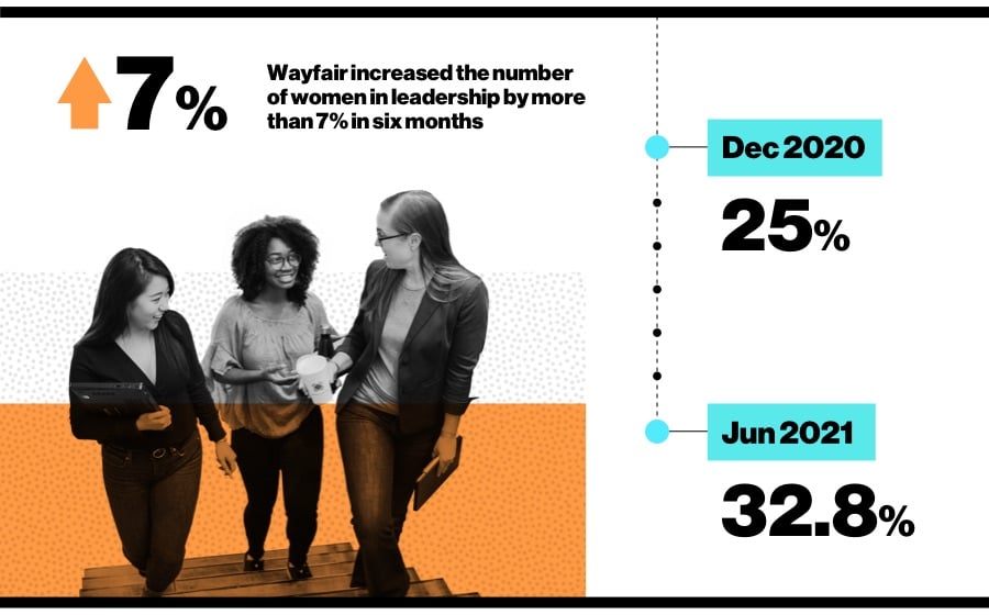 Through the first cycle of introducing this language awareness, Wayfair learned that women were rated higher overall than men on their performance reviews for the first time in many cycles. The company increased the number of women in leadership by more than 7% in six months, from 25% at the end of the fourth quarter of 2020 to 32.8% at the end of June 2021.