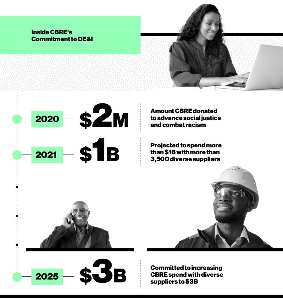 In October 2020, shortly after the police killings of George Floyd and Breonna Taylor intensified the spotlight on racial justice and inequality in the United States, CBRE pledged to spend $1 billion with diverse suppliers in 2021 and to grow this to $3 billion in five years. Like many leading companies, the Dallas-based firm understands the ways in which racial injustice can be addressed through supplier diversity programs.