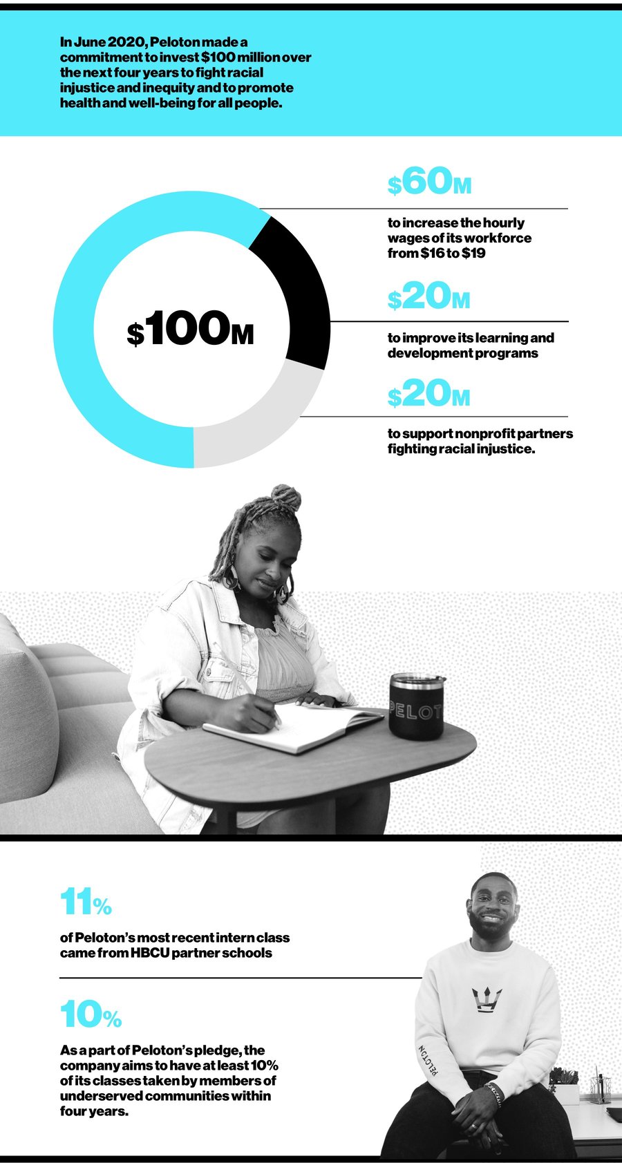 In June 2020, Peloton made a commitment to invest $100 million over the next four years to fight racial injustice and inequity and to promote health and well-being for all people. Within the pledge, the company committed $60 million to increase the wages of its hourly workforce from $16 to $19; $20 million to improve its learning and development programs; and $20 million to support nonprofit partners fighting racial injustice.