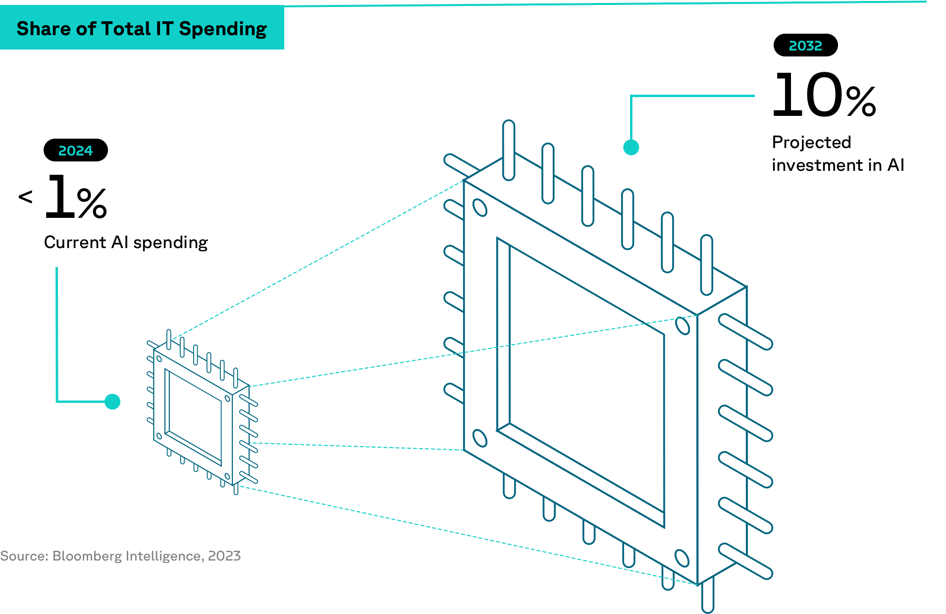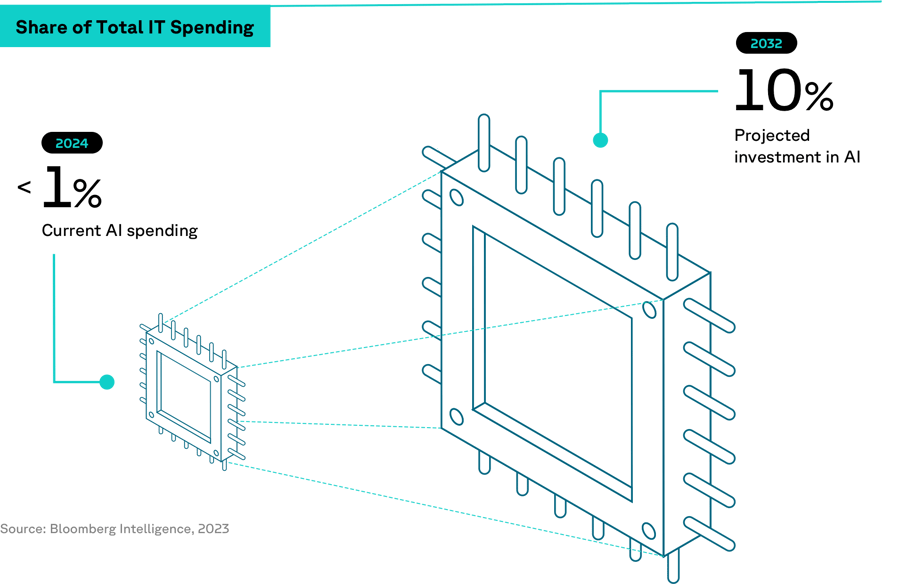 Quick-win thinking may still dominate the current AI landscape. A 2023 Bloomberg Intelligence report found that while generative AI could attract 10% of all IT investment by 2032, current AI spending remains less than 1% of the share of total IT spending—inclusive of expenditures on hardware, software services, the gaming market and advertising. The findings indicate a lingering experimental attitude towards AI, rather than full-confidence adoption.