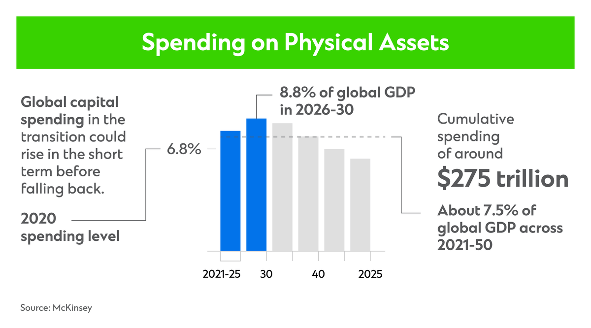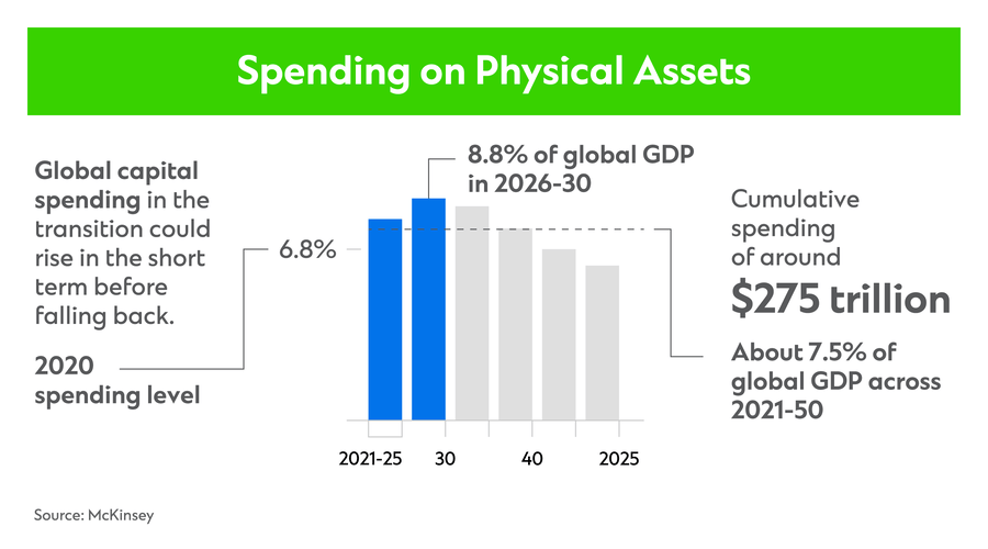 Research from McKinsey suggests $275 trillion in cumulative spending on physical assets is needed between 2021 and 2050 to successfully shift to a net zero economy.[1] That need is greatest in the world’s cities, which account for more than 70% of carbon emissions and 80% of global GDP.[2]