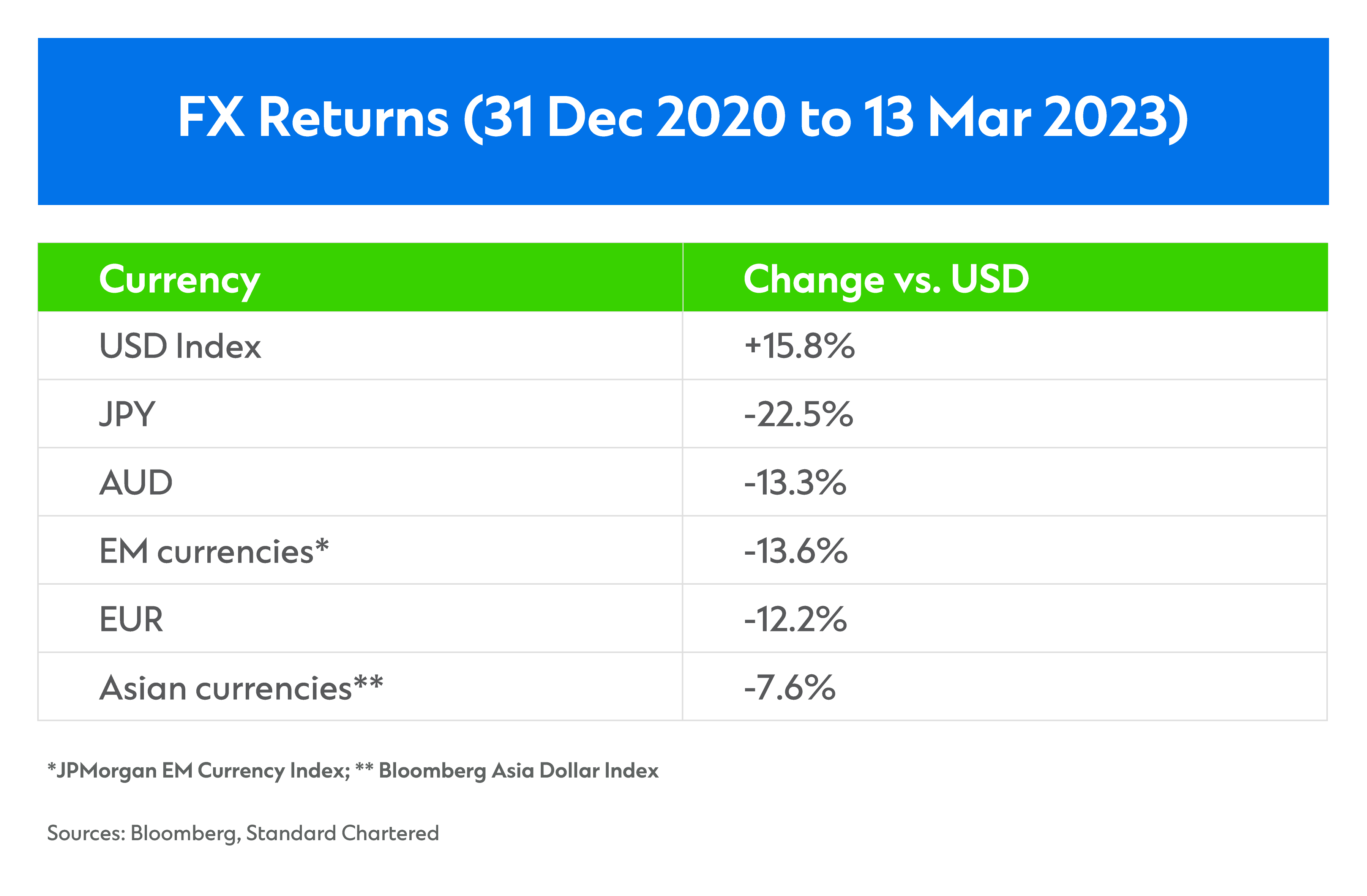 We can see this impact in terms of currency exposure as well. As the table below illustrates, between January 2021 and mid-March 2023, many major currencies, including those of Emerging Markets, weakened in the face of the unusually strong US Dollar. While this could partially reverse, should the USD weaken in 2023 as expected, even a small allocation beyond local market assets would have helped smoothen one’s investment performance in the preceding years.
