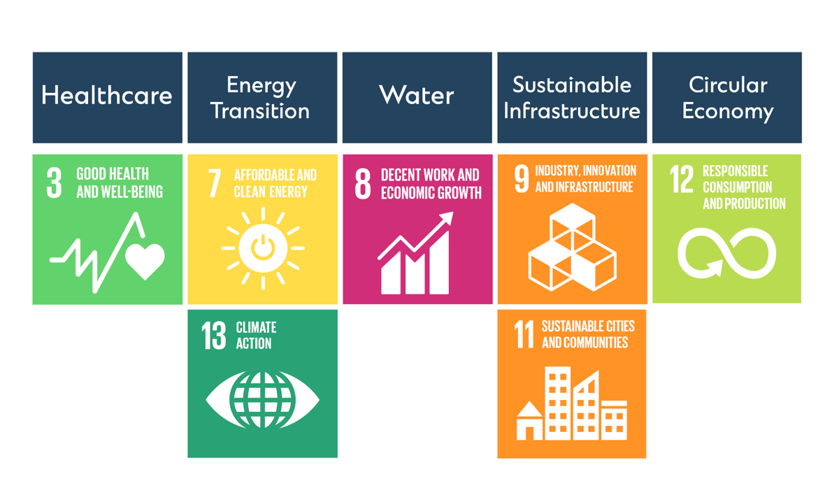 Besides applying the SDG lens to an investors’ core portfolio, there are specific sustainability themes that investors can look into. Sustainable thematic strategies allocate capital to companies contributing towards achieving the targets set out in the SDGs.