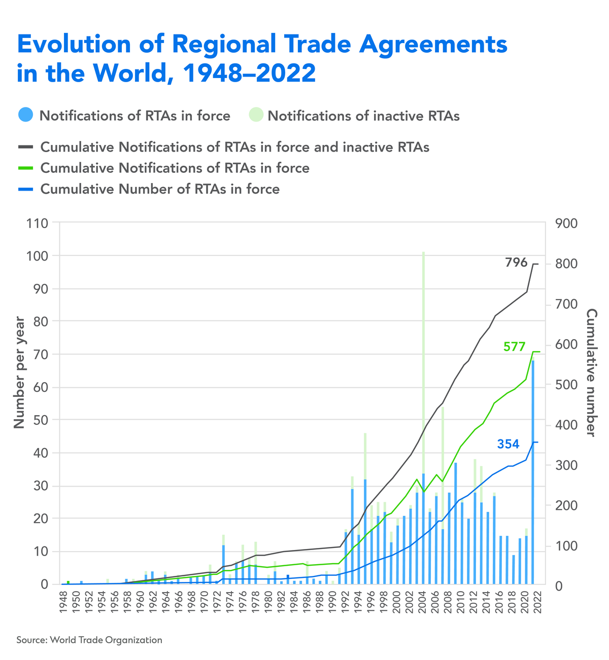 Global trade reached a record $28.5 trillion in 2021, increasing 13% relative to pre-pandemic levels of 2019.[2] While a confluence of waning economic growth, inflation and changing monetary policy has the World Trade Organisation (WTO), IMF and OECD forecasting a deceleration in trade growth ahead,[3] global supply chains and trade corridors are more integrated than ever. Trade among APAC economies, for instance, reached its highest level in three decades last year.[4] And the WTO recently recorded a record number of Regional Trade Agreements (RTA) in force as well as new RTA notifications.[5]