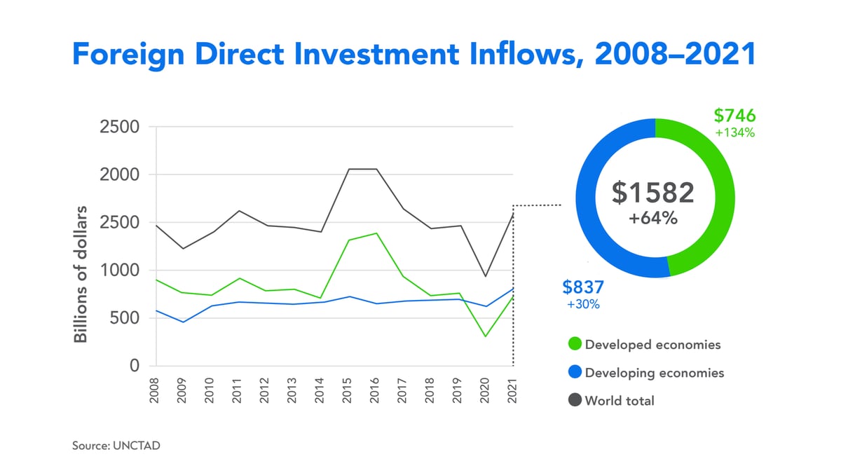 Capital continues to flow across borders, too. In 2021, global foreign direct investment flows reached $1.58 trillion,[10] driven by mergers and acquisitions as well as rapid growth in international project finance. Economic headwinds upended momentum for much of 2022, yet the long-term trend of money pursuing opportunity across borders remains intact and will for the foreseeable future.