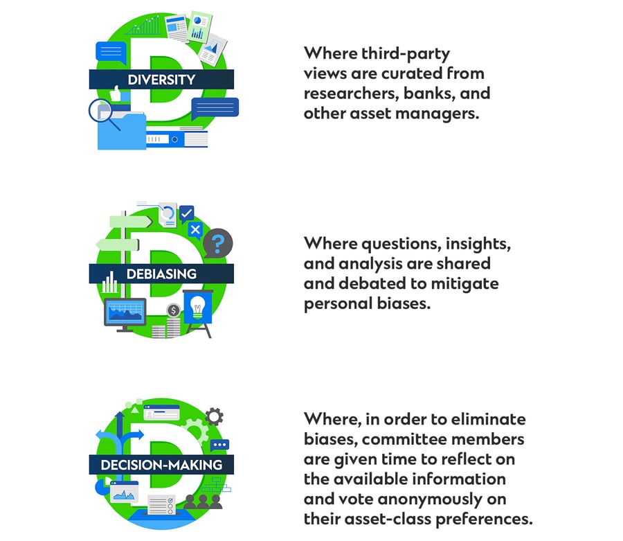 These are critical steps in the investment process, and they are founded on the knowledge that everybody has behavioral biases: hindsight bias, confirmation bias, hierarchical bias, familiarity bias, and so on. These biases can become entrenched within large institutions, which is why the CIO team at Standard Chartered has designed its investment process to filter biases and derive maximum benefit from the collective wisdom of a diverse group of experts.