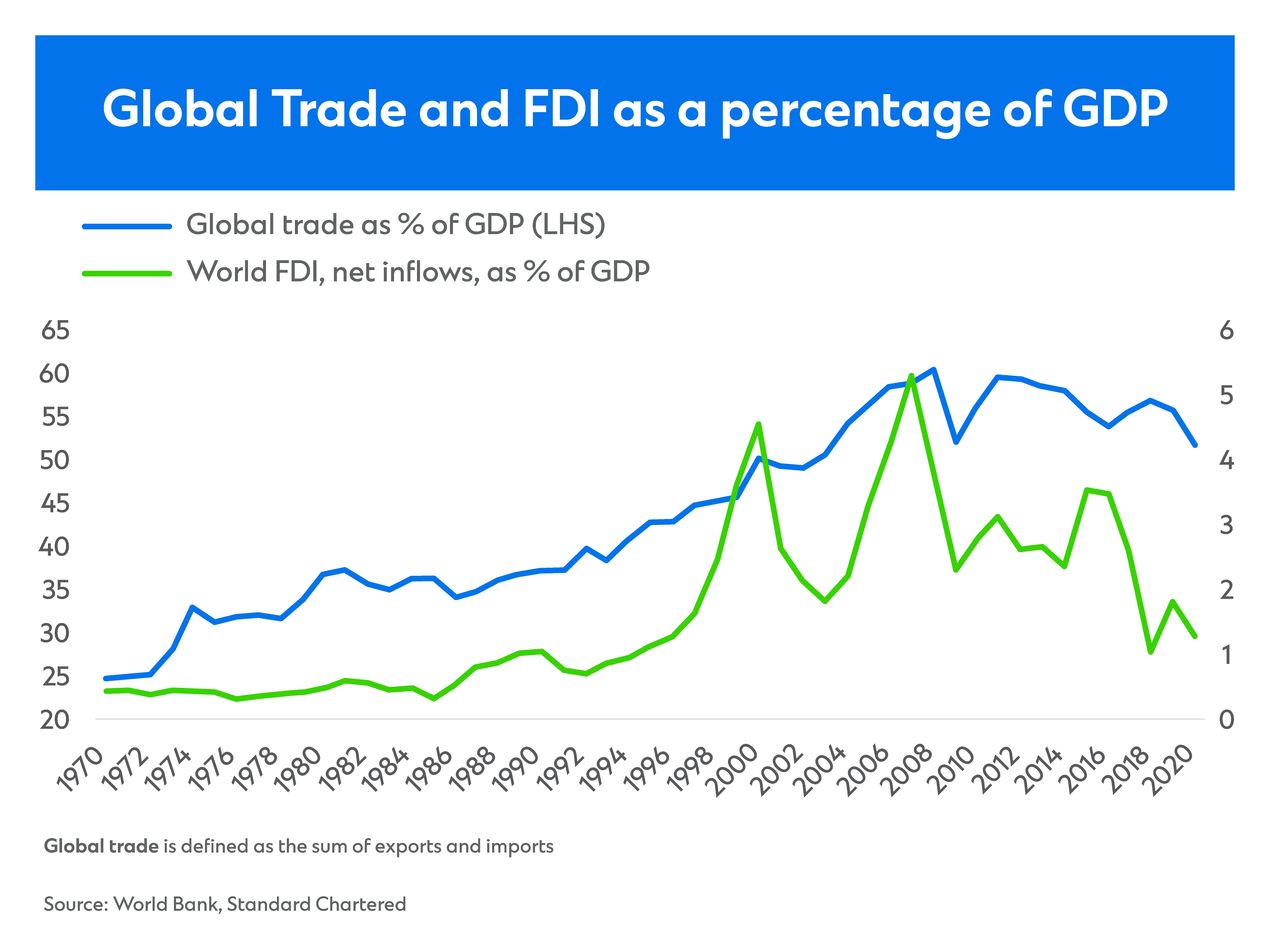 One of the main drivers of ‘lowflation’ was the acceleration of globalization following the initiation of diplomatic ties between the US and China in the 1970s, the collapse of the Berlin Wall in 1989 and China’s accession to the World Trade Organization in 2001. These three events unleashed a huge wave of disinflationary pressures as companies focused on redirecting investment and production aimed at increasing cost efficiency. This trend is best evidence by the rise in the trade intensity of global economic activity (see chart below).