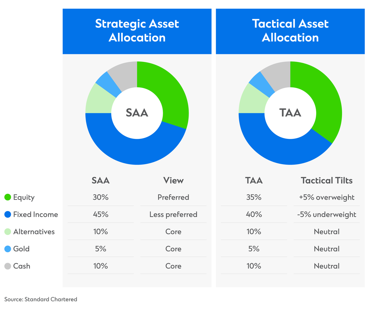For this reason, Standard Chartered’s approach includes a tactical element – Tactical Asset Allocation - in addition to the SAA.