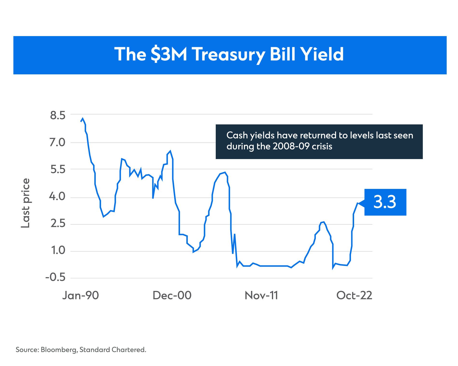 Since 2008-09, this cash yield threshold was largely zero, which meant there was little reason to consider a significant allocation to cash for purely investment reasons (the TINA or ‘There Is No Alternative’ argument for riskier assets like equities). Today, however, the 3-month USD yield is just above 3.5% and could rise further until the Fed hiking cycle peaks. This significantly raises the threshold for other asset classes making cash more attractive relative to other major asset classes.