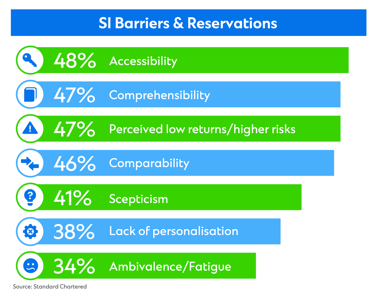 Despite their best intentions, most people don’t know where to begin their sustainable investment journey. Nearly half of investors surveyed by Standard Chartered cited a lack of accessibility as a key barrier followed closely by comprehensibility. Removing those barriers is vital to accelerate inflows.