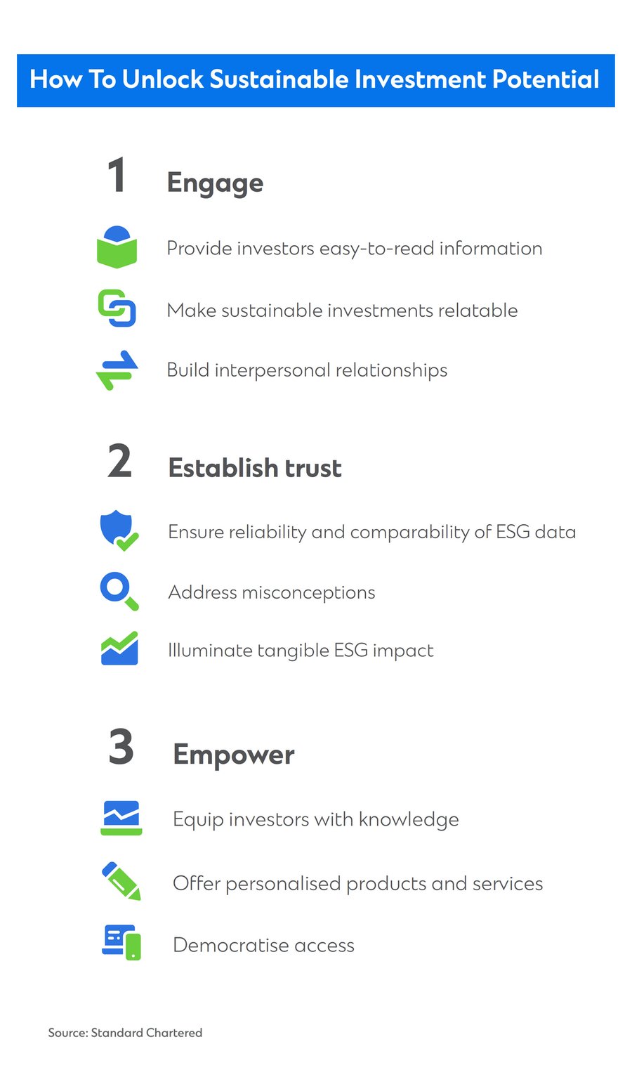 “The challenge for the industry is to make sure that the products being offered really meet investors’ needs and achieve the kind of impact they want to make. That’s why Standard Chartered puts due diligence at the core of sustainable investing.”