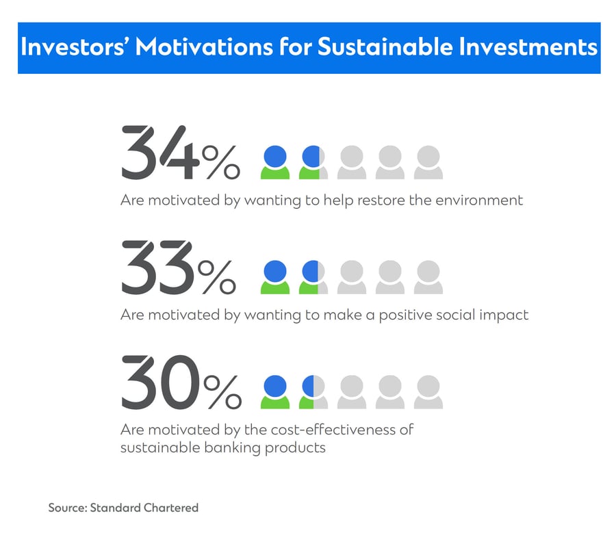 “Today, retail investors list restoring the environment as one of the top factors motivating them to consider ESG investments, which marks a change from even three years ago,” says Eugenia Koh, Global Head, Sustainable Finance, Consumer, Private and Business Banking, Standard Chartered. “Stories in the press, changes in the weather and other factors have investors thinking hard about how they can make an impact with their money.”