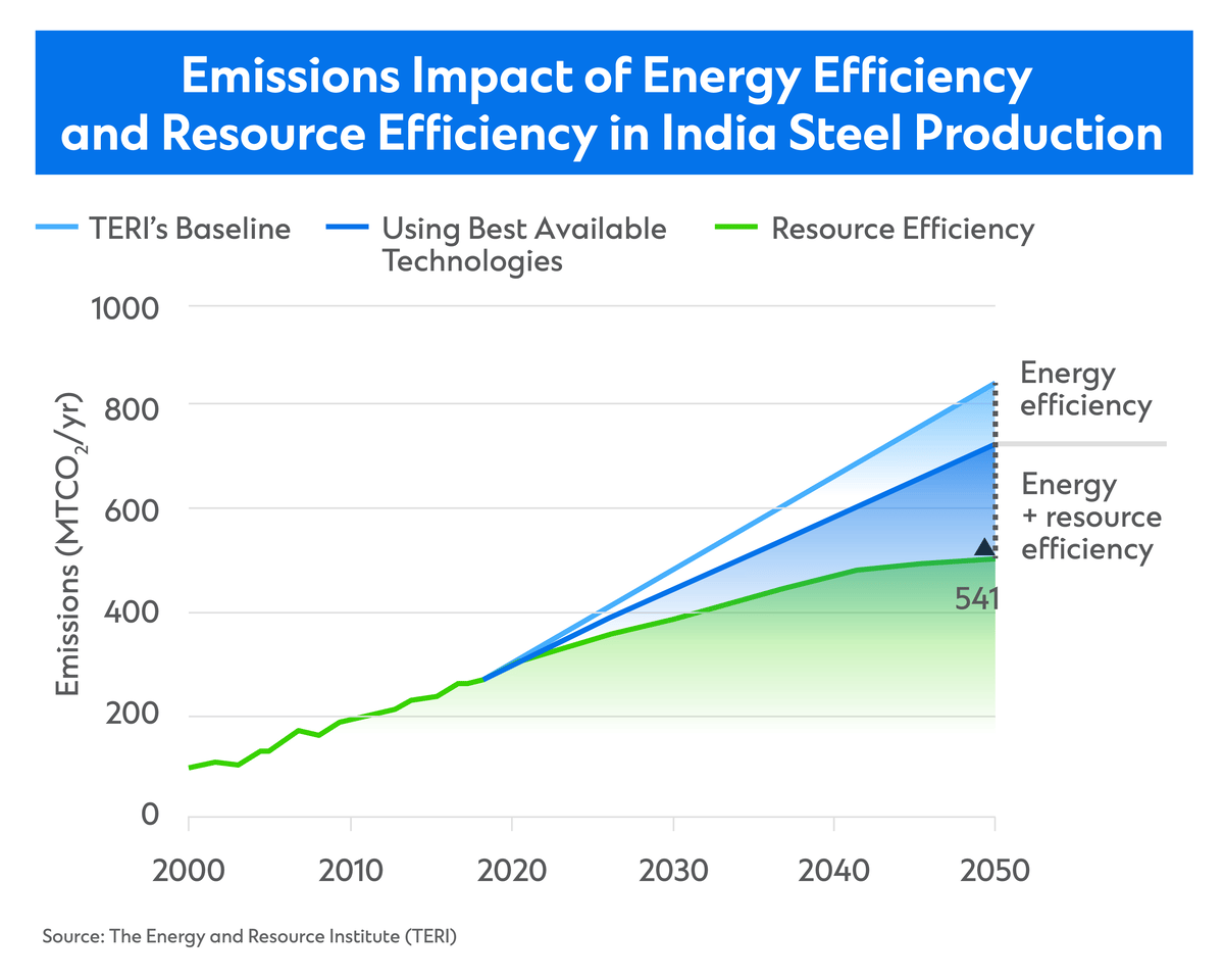 Resource and energy efficiency are vital to mitigate the negative impacts of steel production as India’s economy grows. Encouraging greater use of scrap, for instance, would reduce the amount of raw material required resulting in positive knock-on effects for energy and emissions.
