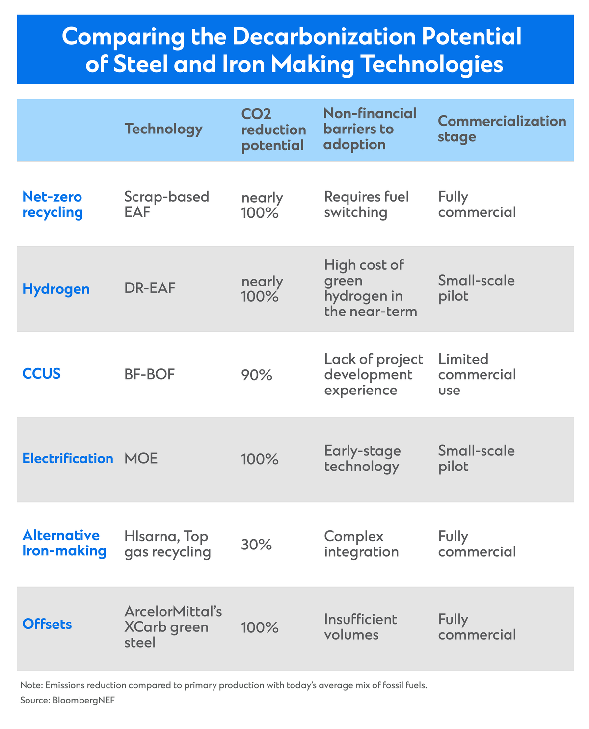 Globally, there are several primary options to decarbonize steel production which include adding carbon capture and storage systems to existing processes powered by fossil fuels, using clean hydrogen to fuel direct reduction, producing more material from recycled scrap in electric arc furnaces powered by clean electricity, and using renewable power in the primary steelmaking process.[8]
