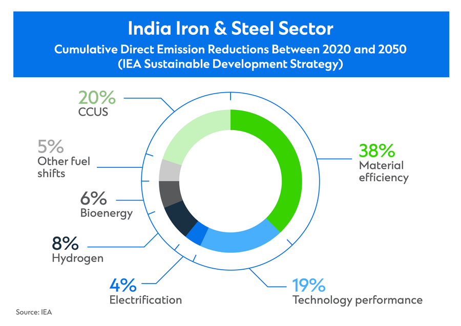 While policies can incentivize action, some steelmakers are taking matters into their own hands. JSW Steel, for instance, aims to cut CO2 emissions by more than 42% by the end of this decade from a 2005 base.[16] The company plans to spend $1.4 billion to decarbonize by shifting to renewable energy and using more scrap.[17]