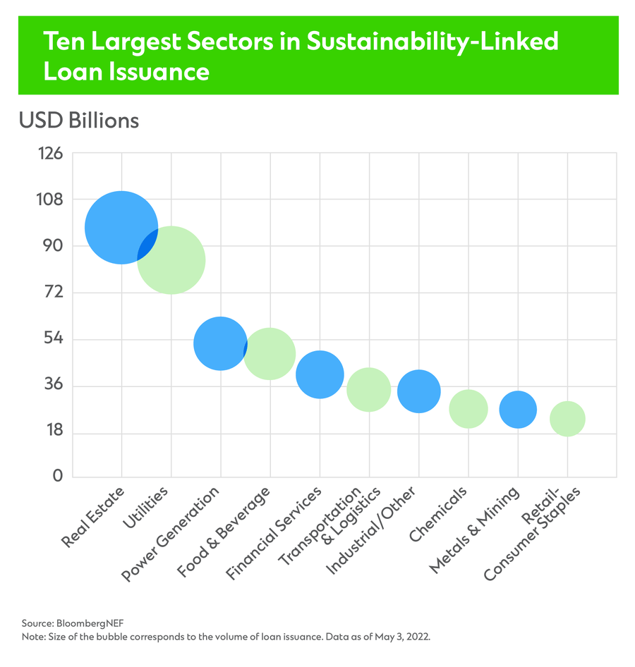 Real estate companies lead the SLL market with $97 billion worth of issuance as of May 2022, followed by utilities with $84 billion.[4] Yet other sectors including transportation and logistics, metals and mining, and chemicals are not far behind and account for a much greater share of total issuance than they do in the green loan market.