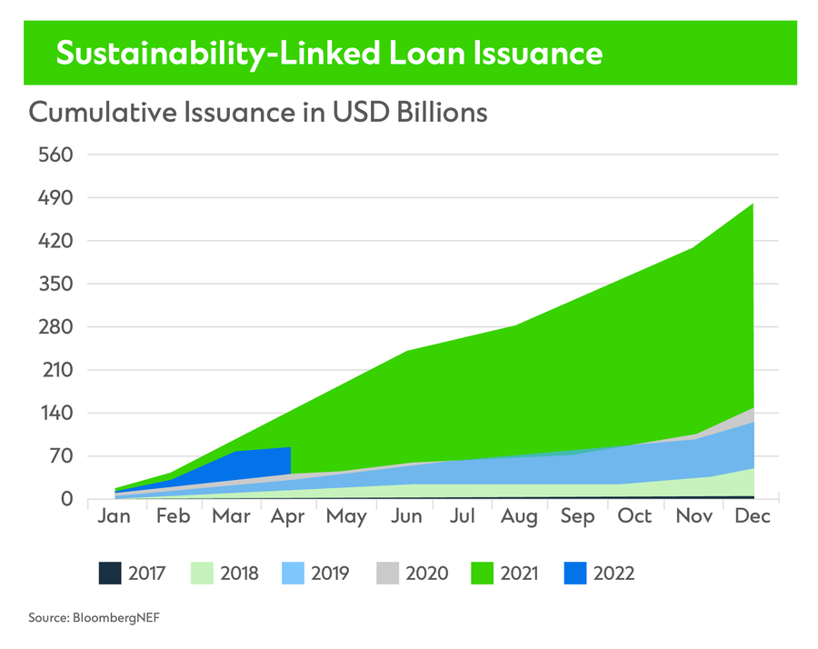 While SLL issuance of $94.4 billion for the first four months of 2022 pales compared with $142.1 billion for the same period last year,[7] this flexible, innovative debt instrument appears on course to become a mainstay of sustainable finance.