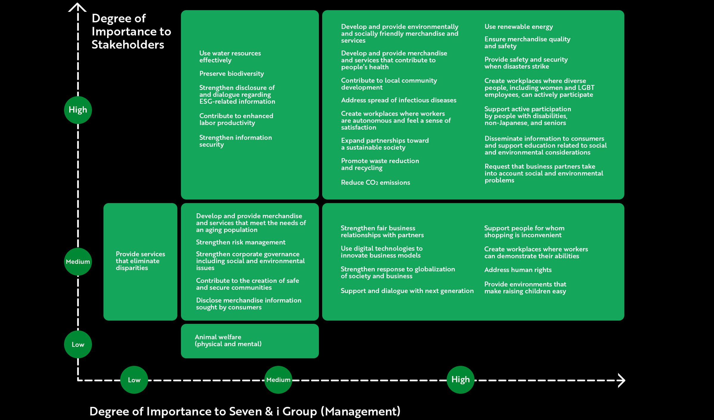 To achieve its next phase in sustainability, Seven & i Group surveyed and conducted dialogue with more than 5,000 customers, business partners, franchisees, employees, and investors to uncover its key materialities.