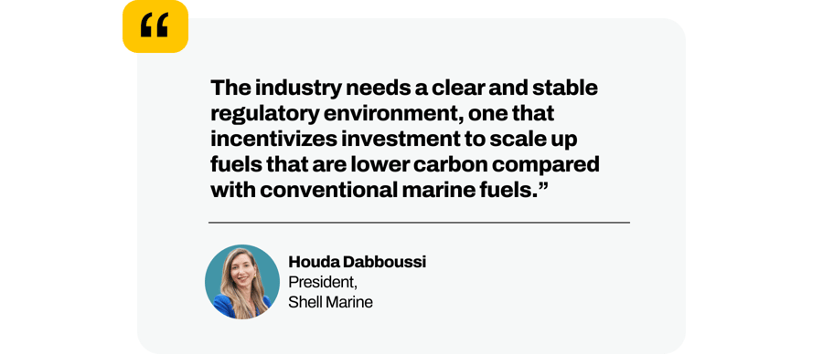 That pathway begins with liquified natural gas (LNG), a methane-based fuel. “It provides the shipping industry with a pragmatic bridge to net zero,” says Houda Dabboussi, President of Shell Marine.