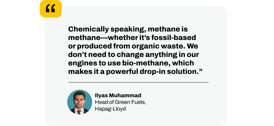“Liquified Bio-Methane (bio-LNG) is the easiest fuel to use for the decarbonization of the shipping sector, supply is relatively high and prices are competitive compared with other lower-carbon fuels,” says Muhammad. For dual-fuel vessels, “Bio-methane is a drop-in fuel, so one does not need to invest in retrofits or buy new dual-fuel engines.”
