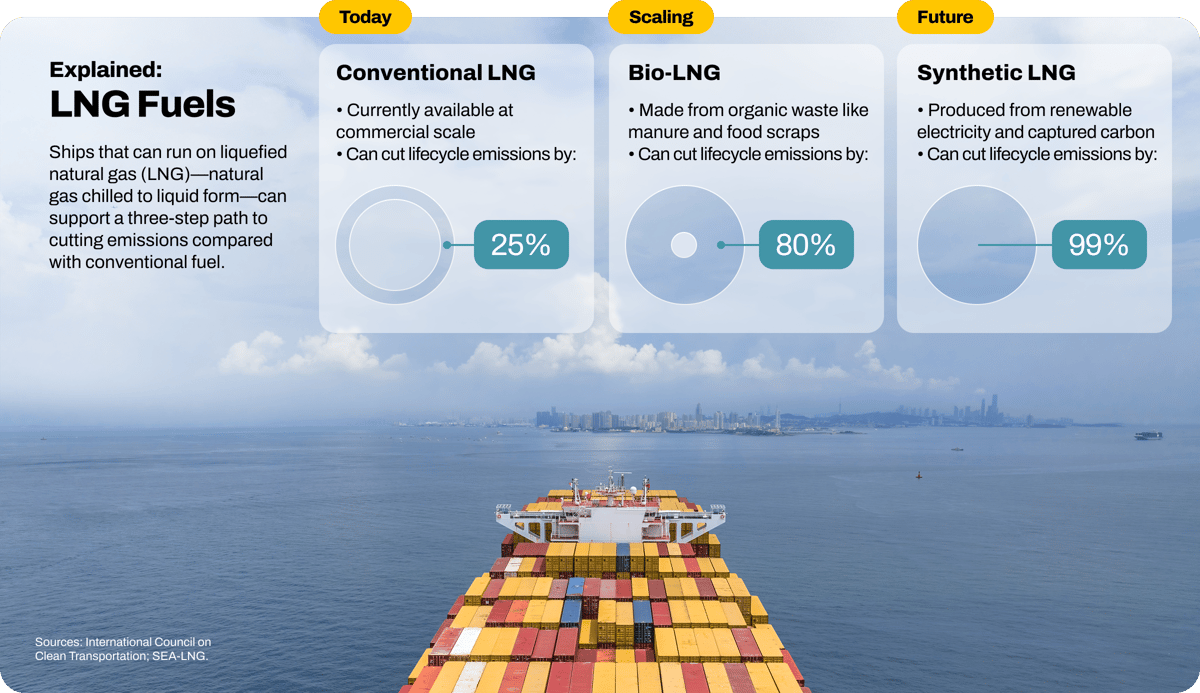 Available at commercial scale now, LNG delivers lifecycle greenhouse gas reductions versus conventional marine fuel using proven infrastructure that continues to expand globally. Dual-fuel vessels designed to run on methane (LNG) and liquid fuels maximize flexibility and optionality: They can operate using LNG as a primary fuel, can switch to conventional or bio-liquid fuels when required, blend in bio-LNG as the supply scales, and ultimately, transition to synthetic LNG produced from renewable energy.