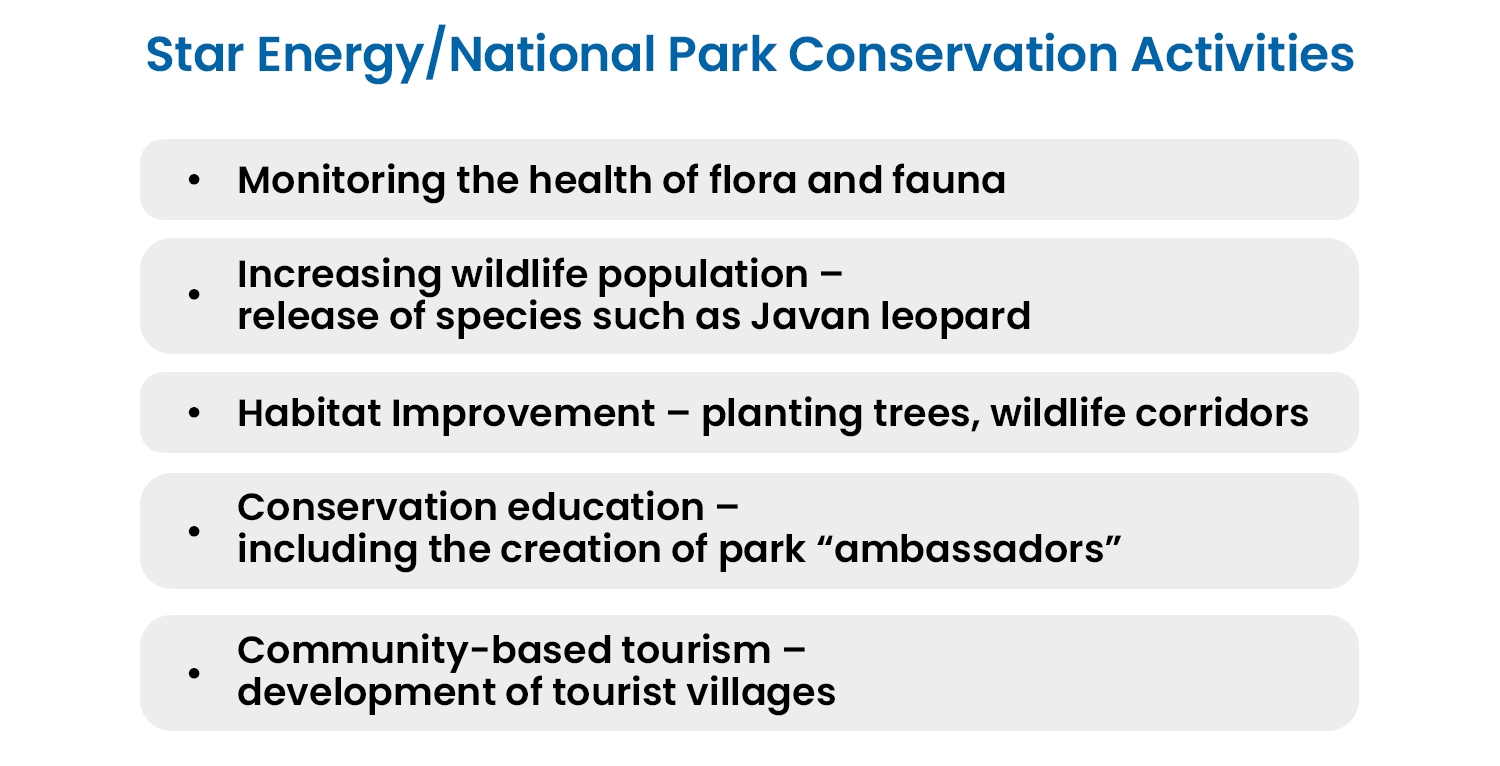 “Star Energy Geothermal’s collaboration with the national park started in 2017,” said Azhar. “Since then, we’ve seen some significant benefits in terms of increased forest and wildlife protection, as well as projects focused on habitat improvement and monitoring the surrounding flora and fauna.”