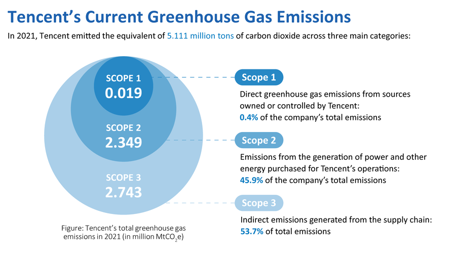 Based on this carbon audit, Tencent has pledged to achieve carbon neutrality not only in its own operations (Scopes 1 and 2), but also in its supply chain (Scope 3), where 100% of energy used will be green energy by no later than 2030.