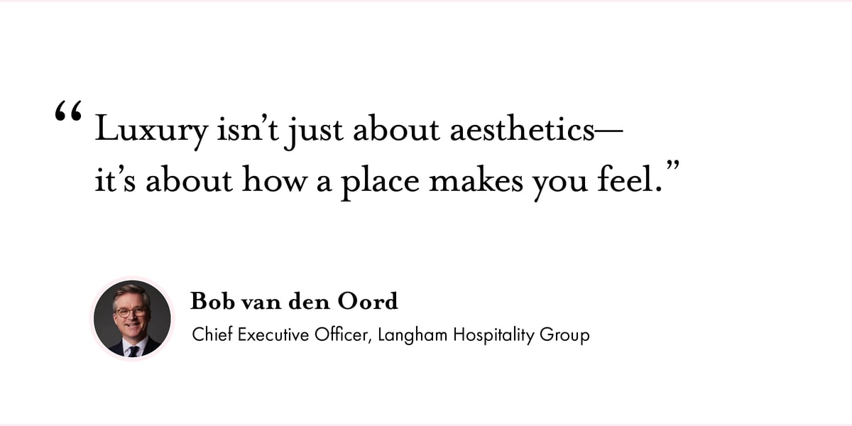 “Luxury isn’t just about aesthetics—it’s about how a place makes you feel,” says Langham Hospitality Group CEO Bob van den Oord. “We had a guest write to us and say, ‘Every time I stay in London, they call me by name. I get my Belvedere martini. When I go to the lounge, they know exactly how I want my eggs cooked. It’s marvelous.’ The guest engaged one of our colleagues in a conversation about the experience. And he simply told him, ‘Well, it’s The Langham Way.’”