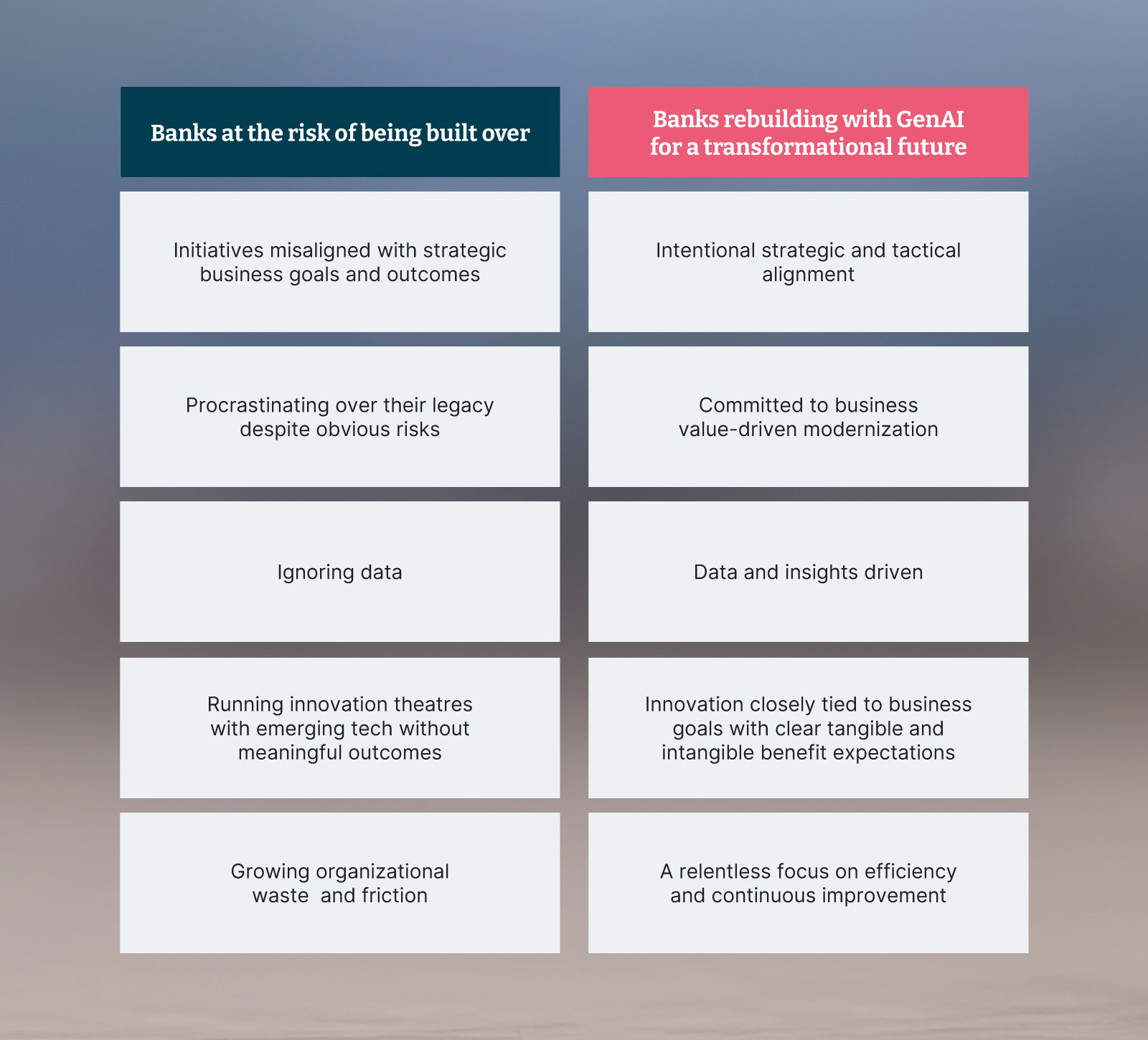 Banks are at a crossroads in adopting Generative AI (GenAI). Institutions that align GenAI with strategic goals, modernize legacy systems, and invest in data-driven innovation stand to gain efficiency and competitive advantage. Others risk being outpaced by inefficiencies and outdated processes.