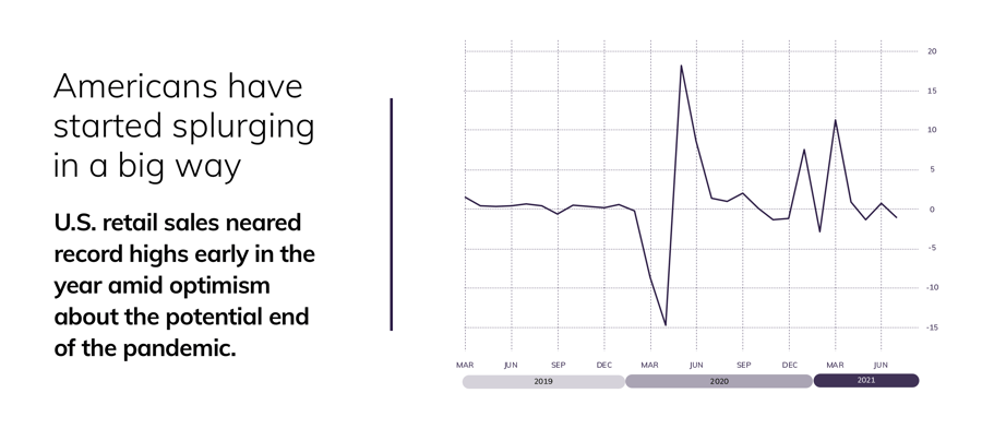After being stuck at home for a year and a half, many affluent Americans have started splurging in a big way. Those with extra funds are choosing to enjoy their money whether it’s spent on luxury goods, dining out or an overdue family reunion. Overall, U.S. retail sales neared record highs early in the year amid optimism about the potential end of the pandemic.