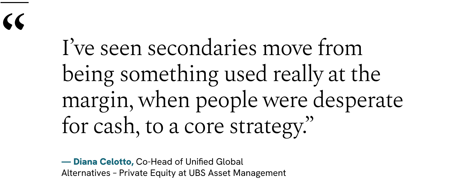 “I’ve seen secondaries move from being something used really at the margin, when people were desperate for cash, to a core strategy,” says Diana Celotto, Co-Head of Unified Global Alternatives – Private Equity at UBS Asset Management.