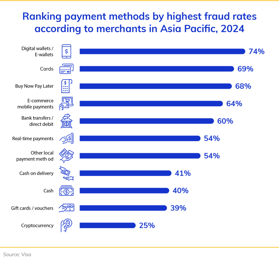 The most widely accepted payment methods, like digital wallets and cards, experience the highest rates of fraud. Meanwhile, buy-now-pay-later, mobile payments, debit transfers, and real-time payments, which are gaining popularity across Asia Pacific, are similarly seeing rising fraud rates, according to Asia Pacific merchants.