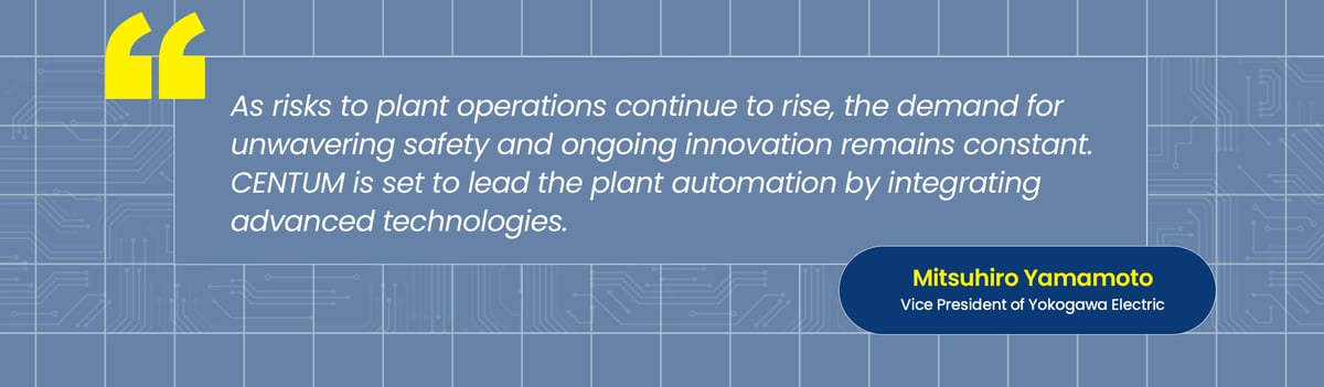 CENTUM is at the heart of these developments of capturing the benefits of automation and AI for industry. The latest 10th-generation of CENTUM features expanded scope of control and monitoring, predictive monitoring and ability to reduce operator workload. It also has greater cybersecurity features and can deliver AI-driven plant operations which leverage the knowhow of plant operators.[9]