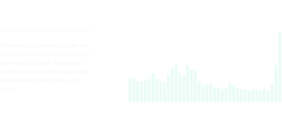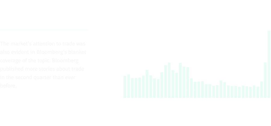 Regionally, discussions of Trade & Taxes rose everywhere, but nowhere more than in Asia. Asia is where tariffs are likely to have their biggest effect, according to the Bloomberg US Tariff-Impact Matrix, a tool that helps identify companies’ exposure to US tariffs. As of late June, it found that Asia-based companies will face the highest median tariff rate (15%), which will cut their profits by 9.6%—impacting these companies more than tariff impacts in any other region.