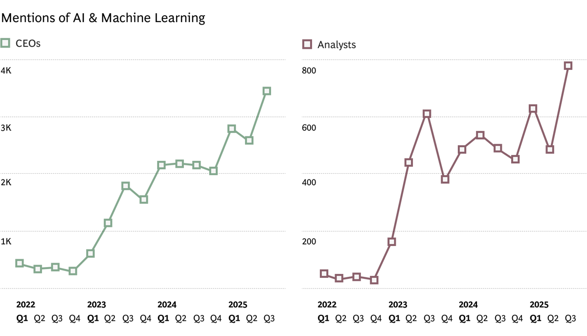 The consequence, says De Bellefonds, is the widening “AI value gap” wherein early movers are building stronger technology stacks, while laggards are trapped in a cycle of stalled pilots and mounting investor skepticism. With analysts discussing not only AI & Machine Learning but also Robotics, Driverless Vehicles and Automation this quarter, the market is keen to see AI executions deliver ROI.