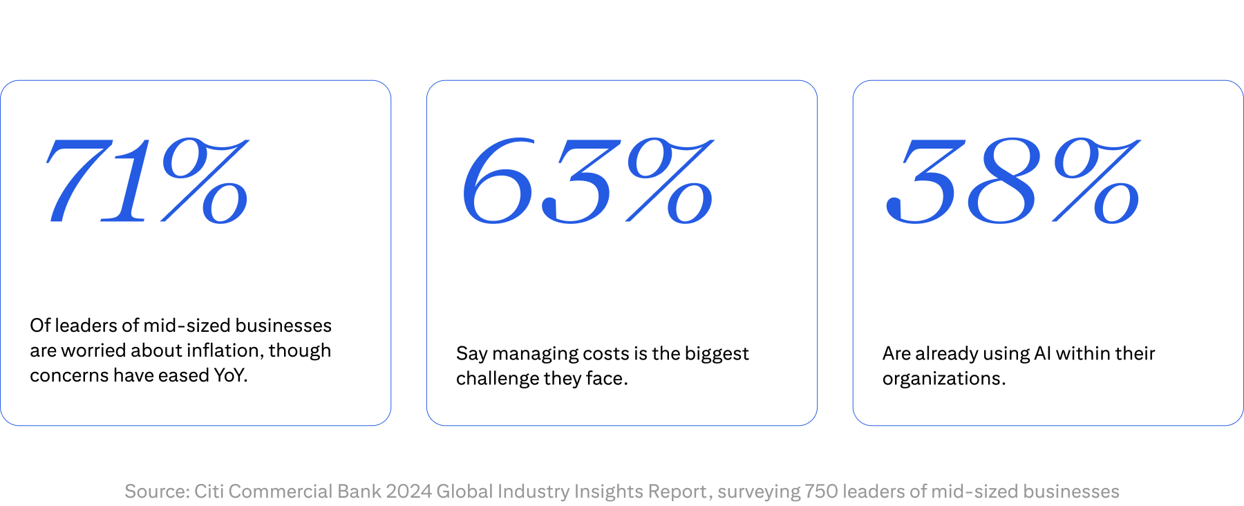 In healthcare, as with most industries, vital help could come from AI and automation—but ensuring security and affordability poses challenges for the working capital resources of mid-sized operations. These concerns could be why three in five healthcare organizations surveyed for Citi’s 2024 Global Industry Insights report have not yet adopted any form of AI in their organization.