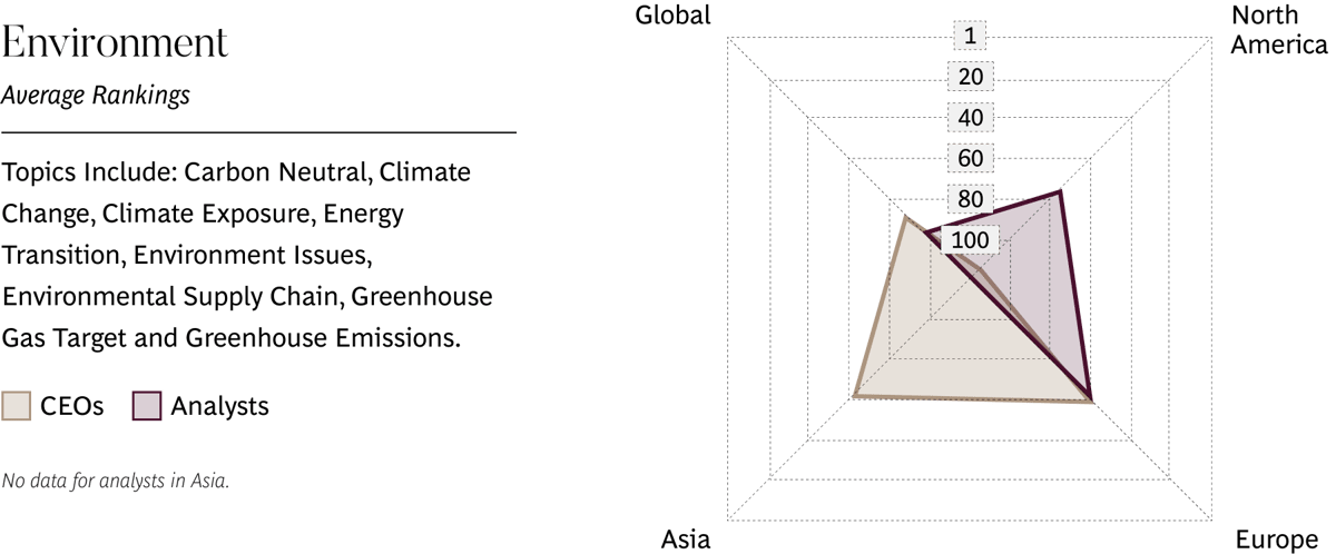 At the global level, CEOs and analysts are most at odds over the importance of Costs—analysts ranked the meta topic 34th in Q1, compared to 66th for CEOs—and Technology & Innovation, which CEOs ranked 16 places higher than analysts.