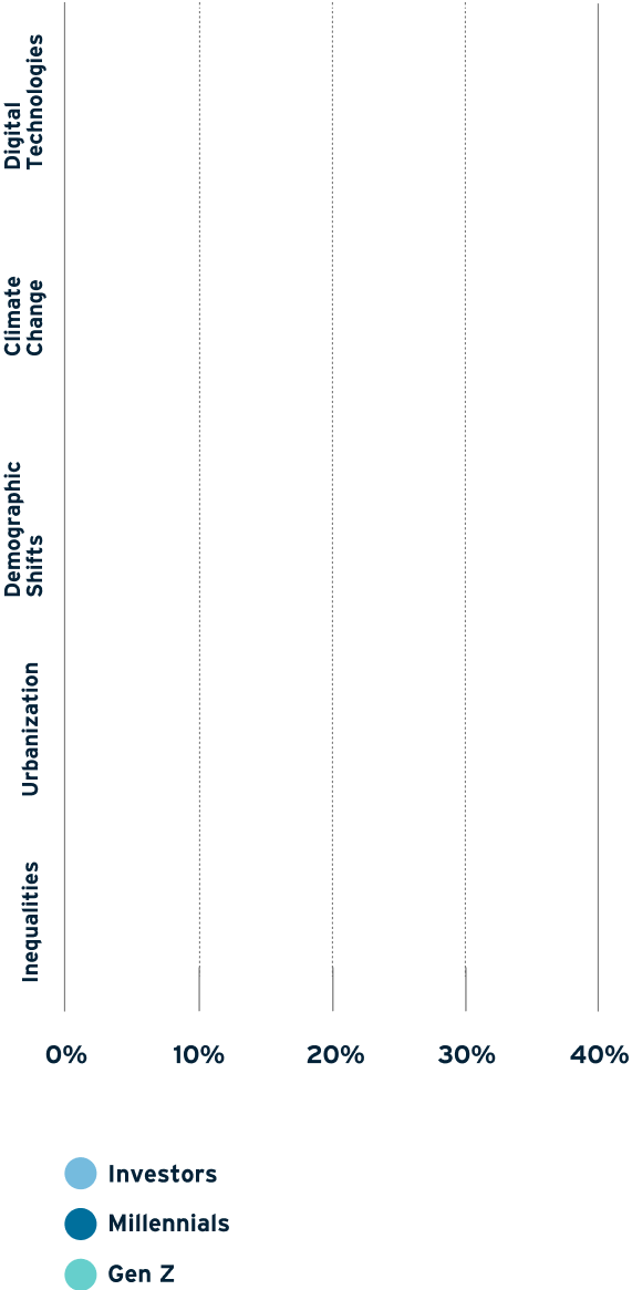 As for how they feel about the impact of megatrends on our ability to achieve a sustainable future, while all audiences are optimistic overall, investors are more so than millennials or Gen Z. That could be because they feel more confident about responding to megatrends through their strategies (91%) than either Gen Z (77%) or millennials (73%), implying that the ability to put capital behind their decisions contributes to their sense of empowerment.